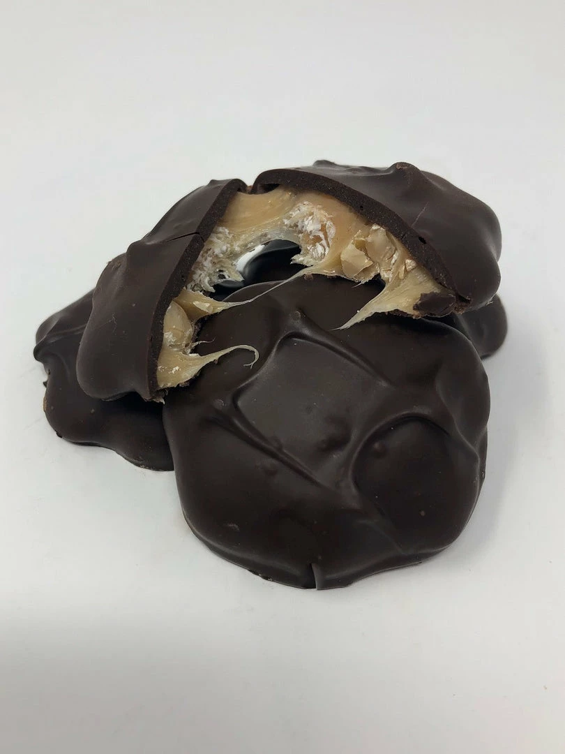 Dark Chocolate Cashew Caramel Patties. Cashew pieces surrounded by smooth, creamy caramel and covered in delicious dark chocolate, similar to a “turtle”!! This listing is for a 1 pound box of gourmet dark chocolate cashew caramel patties.