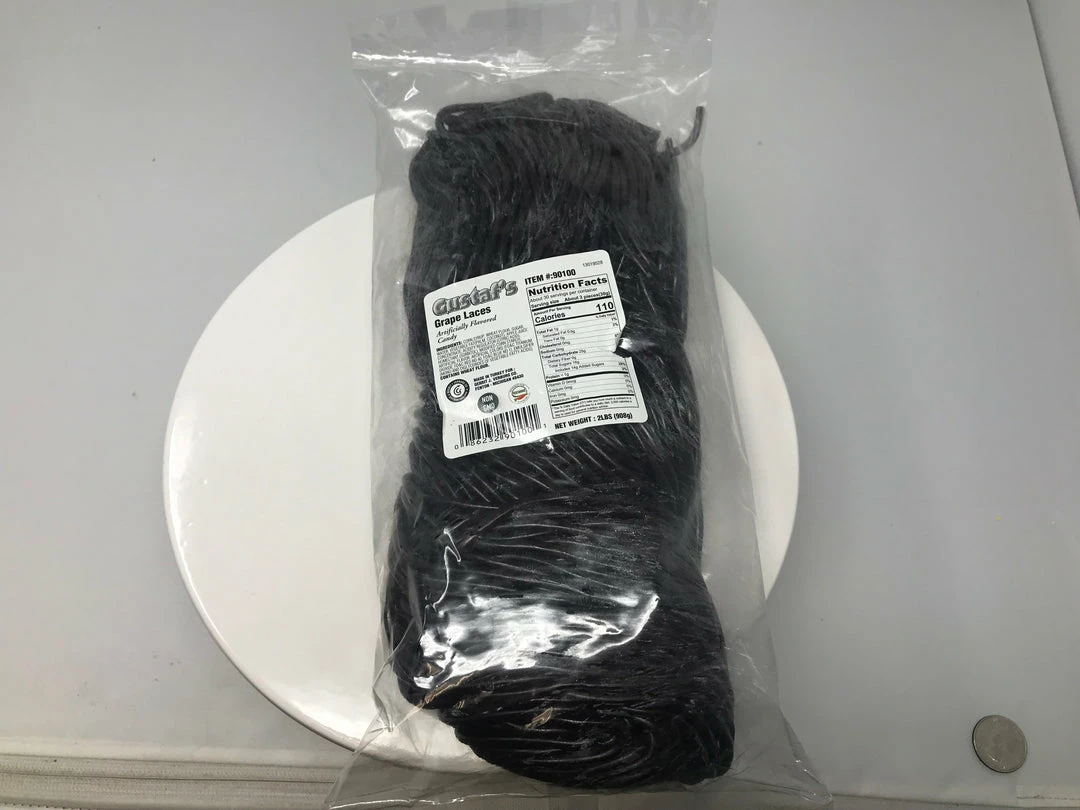 Grape Shoestring Licorice. Made in the Netherlands, this grape flavored licorice shoestring is sure to keep you busy for hours!! This listing is for three bulk 2 pound bags of grape shoestring laces.