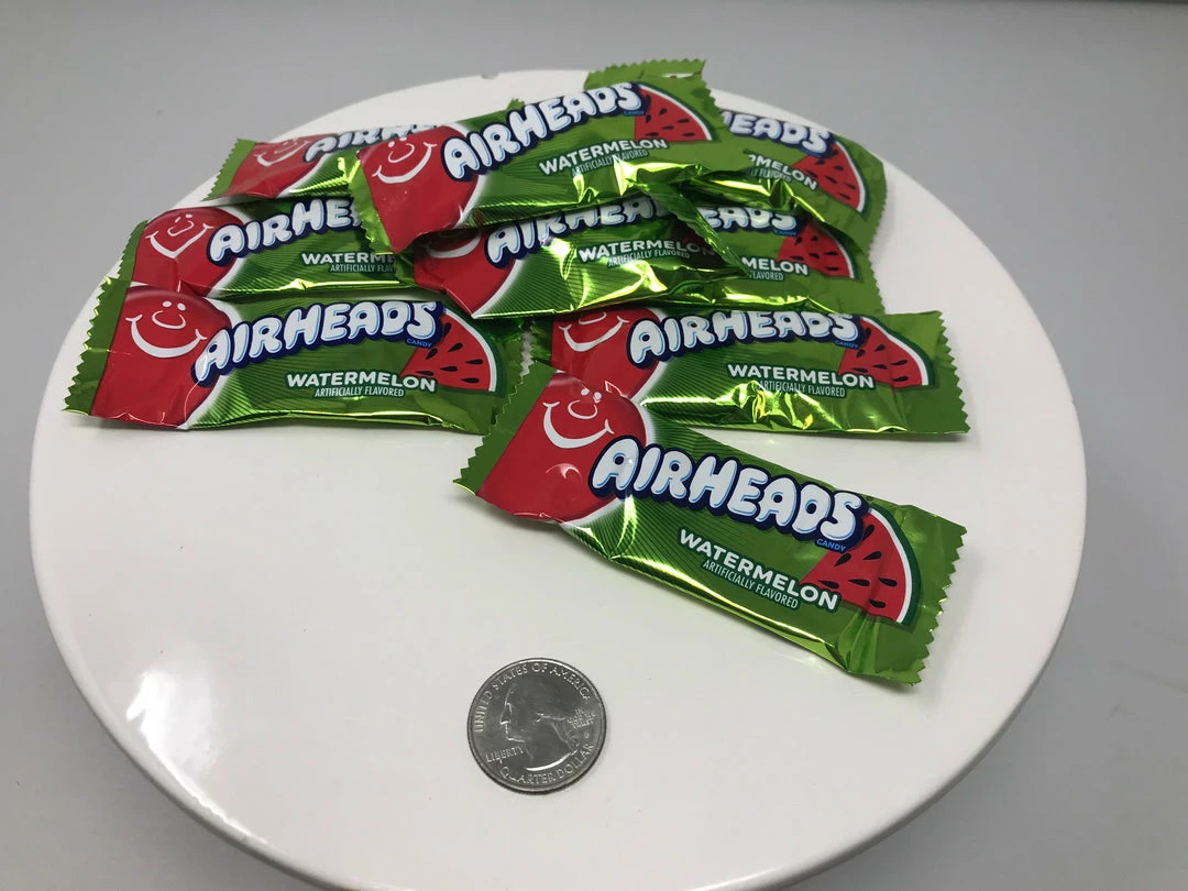 Mini Watermelon Air Heads. A watermelon-flavor sweet chewy candy. This listing is for a bulk 1 pound bag of mini watermelon airheads.
