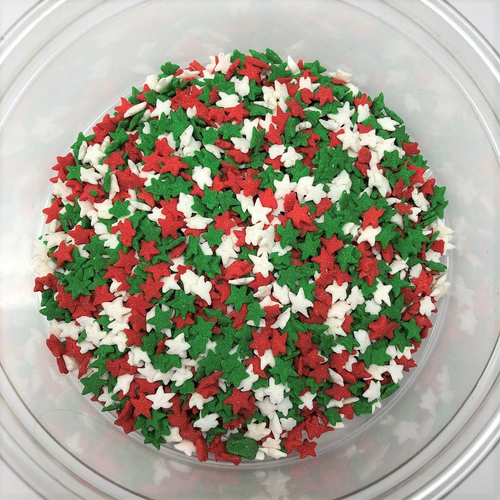 Red, Green, and White Star Shapes. The perfect topping for your cookies, cupcakes, ice cream, or any other dessert! This listing is for a bulk 1 pound package of Christmas Cinco De Mayo star shapes.