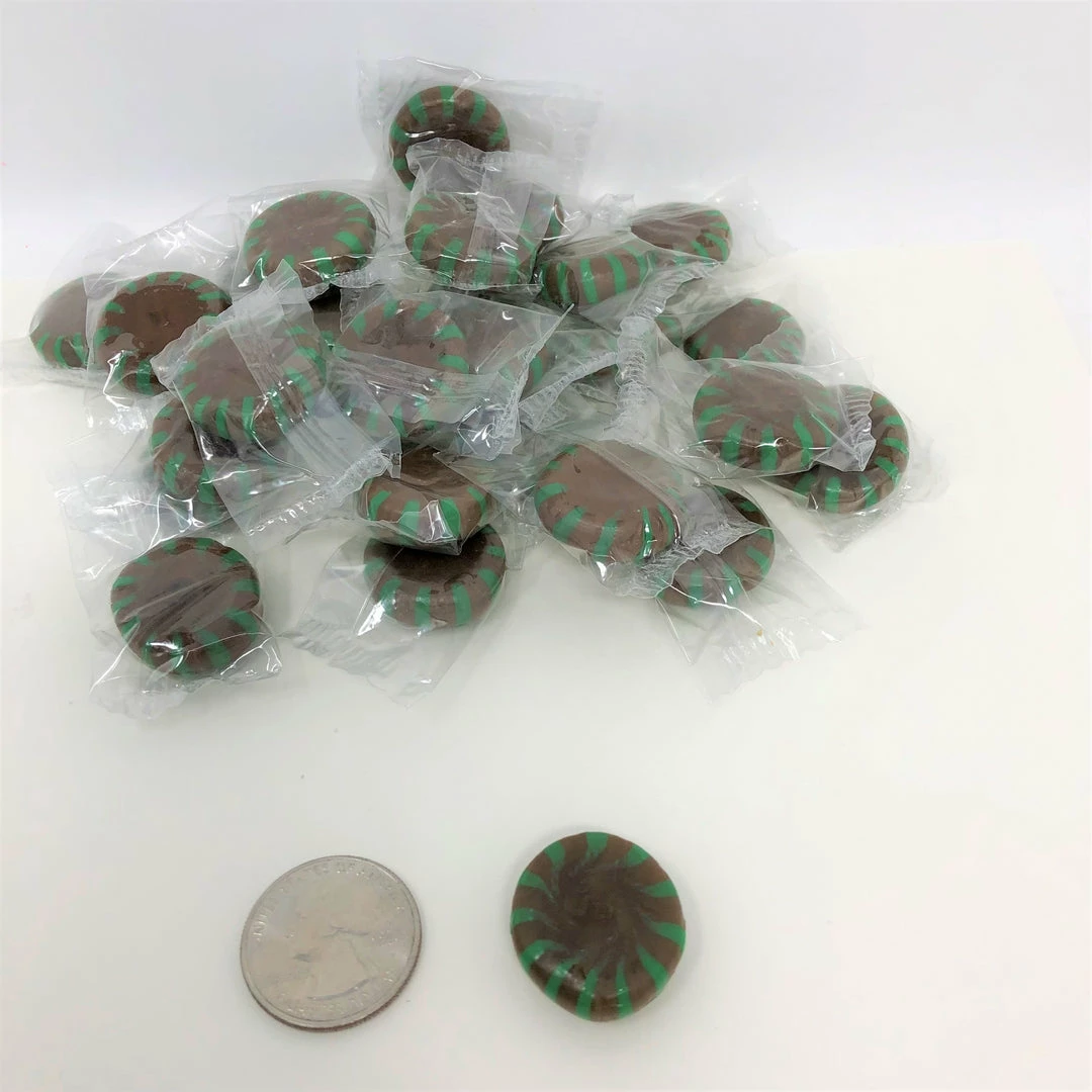 Chocolate brown and green striped Starlight Mints. Individually wrapped hard lozenger-type candies with each candy having both a chocolate and refreshing mint flavor. This listing is for a bulk 1 pound bag of Sunrise chocolate starlight mints.