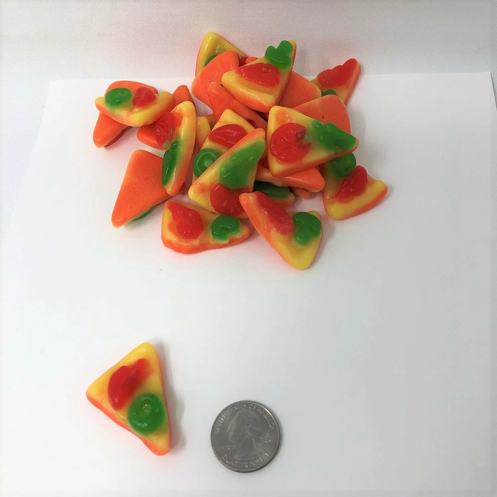 Gummi Pizza Slices. A soft, fruit-flavored gummi pizza slice…a unique and fun candy. This listing is for a bulk 1 pound bag of gummi pizza slices.