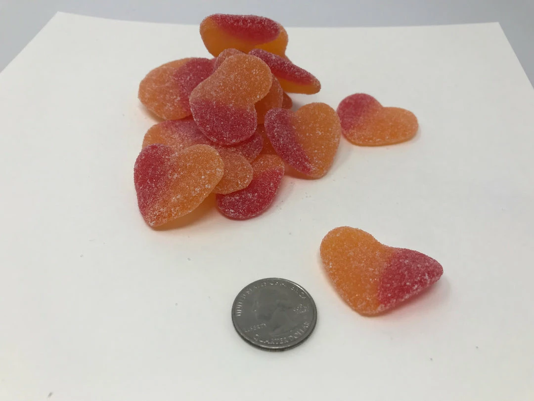 Gummi Sugared Peach Hearts. A fresh, soft, fruit / peach – flavored Heart-Shape Gummy candy. This listing is for a bulk 2 pound bag of Sugar Peach Hearts.
